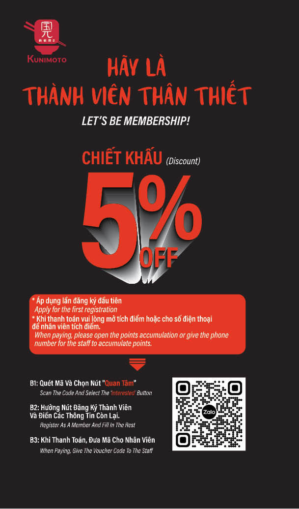 ► Tích đủ 30.000đ dc thăng hạng Thành Viên Bạc và Giảm 5% hoá đơn khi ăn tại Kunimoto.
